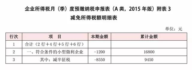 按照國(guó)家稅務(wù)總局《關(guān)于修改企業(yè)所得稅月(季)度預(yù)繳納稅申報(bào)表的公告》(國(guó)家稅務(wù)總局公告2015年第79號(hào))的規(guī)定,符合條件的小型微利企業(yè)在進(jìn)行2015年第四季度企業(yè)所得稅預(yù)繳時(shí),查賬征收企業(yè)應(yīng)按《企業(yè)所得稅月(季)度預(yù)繳納稅申報(bào)表(A類,2015年版)》第9行或第20行的全年累計(jì)所得,分不同情形填報(bào)附表3《減免所得稅額明細(xì)表》第2行“一、符合條件的小型微利企業(yè)”(以下稱“本行”)的累計(jì)和本期減免所得稅額(包括減低稅率和減半征稅所減免的稅額)。“累計(jì)金額”列的填報(bào)按規(guī)定計(jì)算方式計(jì)算的減免稅額,“本期金額”由此次申報(bào)累計(jì)金額-上次申報(bào)累計(jì)金額計(jì)算得出。