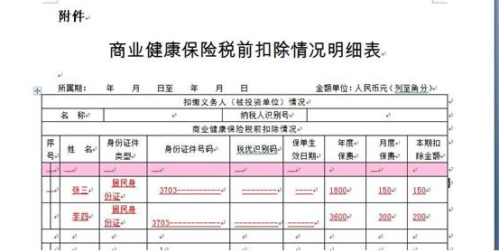 例如:張三、李四在A公司上班,每月稅前工資5000元。張三自行繳納商業(yè)健康保險1800元/年,李四自行繳納商業(yè)健康保險3600元/年,兩人均需向單位財務提供帶“稅優(yōu)識別碼”的保單憑證,單位財務人員在報稅時需要在填報《扣繳個人所得稅報告表》申報表,稅前扣除項—“其他”欄次,并同時填報《商業(yè)健康保險稅前扣除情況明細表》