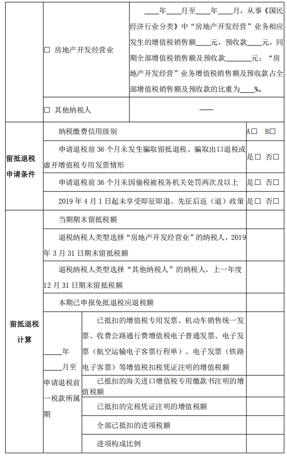 十三、退稅納稅人類型:按照《財政部 稅務總局關于完善增值稅期末留抵退稅政策的公告》(財政部 稅務總局公告 2025 年第 7 號,以下簡稱 7 號公告)第一條第一項規(guī)定申請留抵退稅的納稅人,根據其“制造業(yè)”“科學研究和技術服務業(yè)”“軟件和信息技術服務業(yè)”“生態(tài)保護和環(huán)境治理業(yè)”中銷售收入占比最高的一項選擇;按照 7 號公告第一條第二項規(guī)定申請留抵退稅的納稅人,選擇“房地產開發(fā)經營業(yè)”;按照 7 號公告第一條第三項規(guī)定申請留抵退稅的納稅人,選擇“其他納稅人”。退稅納稅人類型選擇“制造業(yè)”“科學研究和技術服務業(yè)”“軟件和信息技術服務業(yè)”或“生態(tài)保護和環(huán)境治理業(yè)”的納稅人,應填寫“ 年 月至 年 月,從事《國民經濟行業(yè)分類》中‘制造業(yè)’‘科學研究和技術服務業(yè)’‘軟件和信息技術服務業(yè)’‘生態(tài)保護和環(huán)境治理業(yè)’業(yè)務相應發(fā)生的增值稅銷售額 元,同期全部增值稅銷售額 元,占比 %?!比缟暾埻硕惽敖洜I期滿 12 個月,本欄起止時間填寫申請退稅前 12 個月的起止時間,本欄銷售額填寫申請退稅前 12 個月的銷售額;如申請退稅前經營期不滿 12 個月但滿 3 個月的,本欄起止時間填寫實際經營期的起止時間,本欄銷售額填寫實際經營期的銷售額。退稅納稅人類型選擇“房地產開發(fā)經營業(yè)”的納稅人,應填寫“ 年 月至 年 月,從事《國民經濟行業(yè)分類》中‘房地產開發(fā)經營’業(yè)務相應發(fā)生的增值稅銷售額 元,預收款 元,同期全部增值稅銷售額及預收款元,‘房地產開發(fā)經營’業(yè)務增值稅銷售額及預收款占全部增值稅銷售額及預收款的比重為 %?!比缟暾埻硕惽敖洜I期滿 12 個月,本欄起止時間填寫申請退稅前 12 個月的起止時間,本欄銷售額和預收款填寫申請退稅前 12 個月的銷售額和預收款;如申請退稅前經營期不滿 12 個月但滿 3 個月的,本欄起止時間填寫實際經營期的起止時間,本欄銷售額和預收款填寫實際經營期的銷售額和預收款。